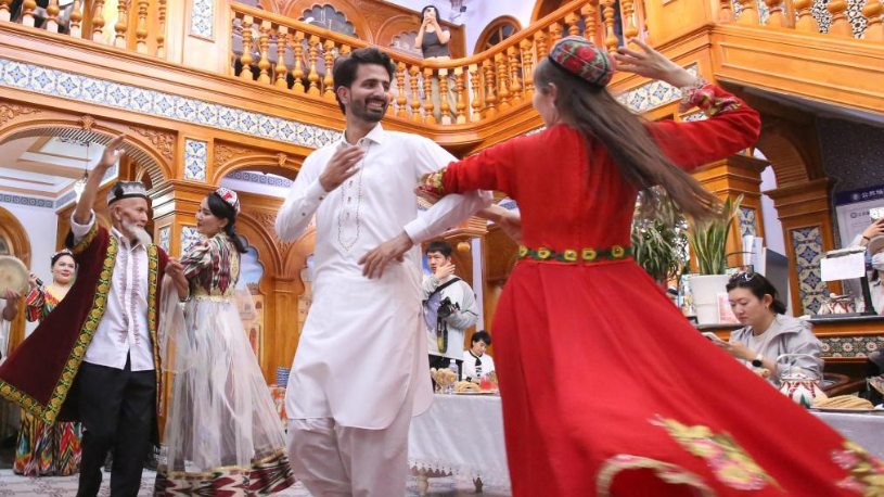 A Pakistani tourist (2nd R, front) dances with a staff member at a homestay, in the Kashgar Ancient City scenic spot, northwest China's Xinjiang Uygur Autonomous Region, Sept. 10, 2025. (Xinhua/Cheng Li)