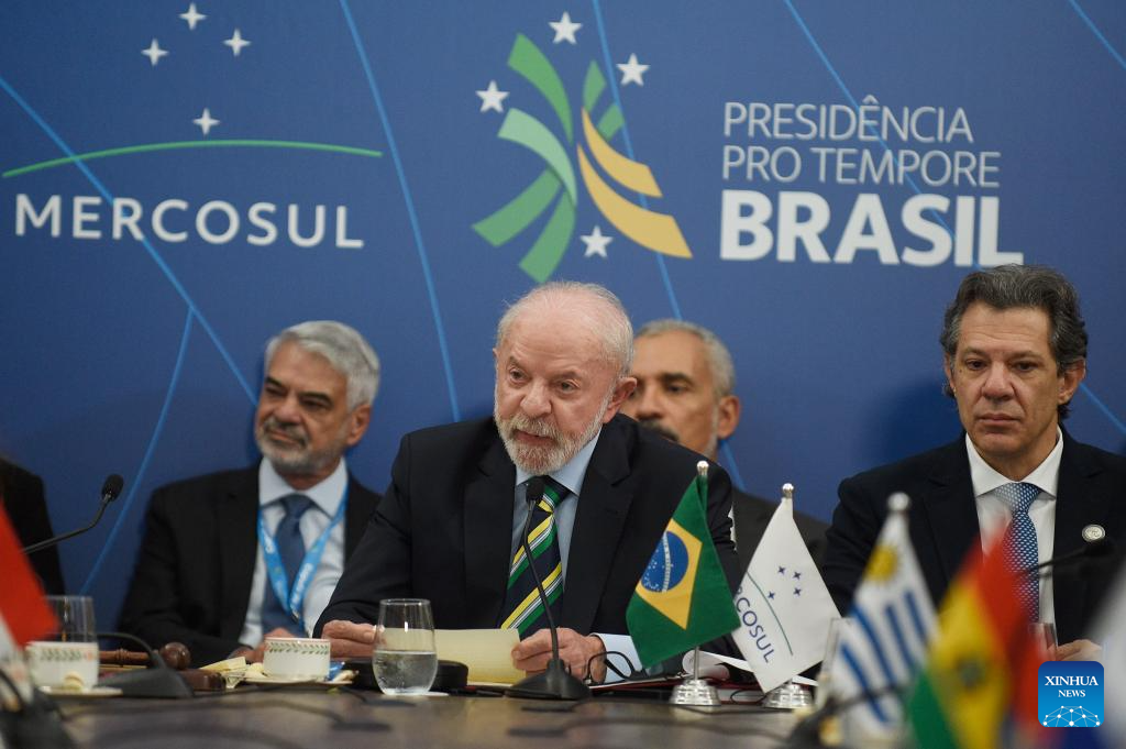 Brazilian President Luiz Inacio Lula da Silva (front) speaks during the 67th Summit of the Heads of State of the Southern Common Market (Mercosur) in Foz do Iguacu, Brazil, on Dec. 20, 2025. The 67th Summit of the Heads of State of the Mercosur was held here on Saturday. (Photo by Lucio Tavora/Xinhua)