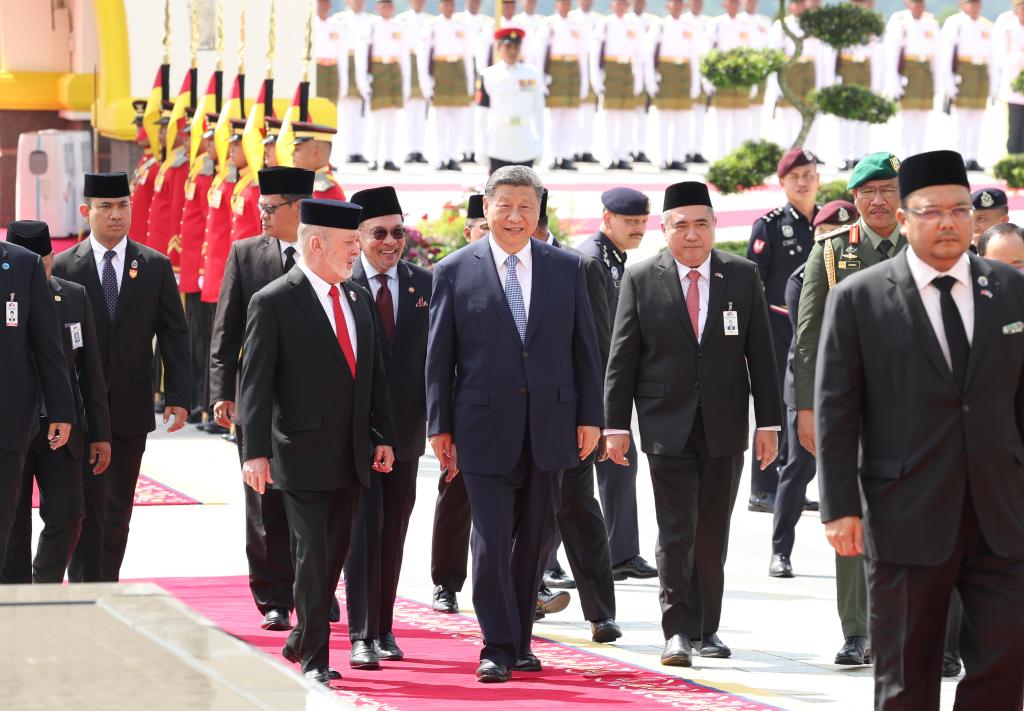 Chinese President Xi Jinping attends a welcome ceremony held by Malaysian King Sultan Ibrahim Sultan Iskandar in Kuala Lumpur, Malaysia, April 16, 2025. Xi met with Malaysian King Sultan Ibrahim Sultan Iskandar at the National Palace in Kuala Lumpur on April 16, 2025. (Xinhua/Huang Jingwen)