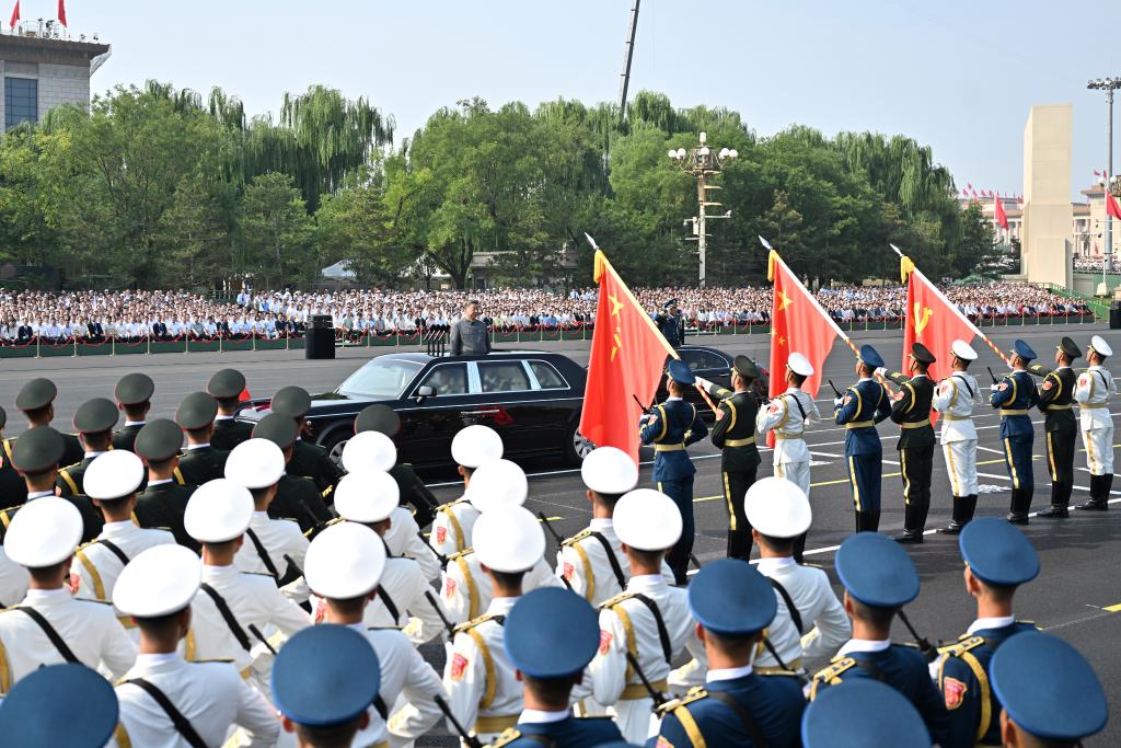 Chinese President Xi Jinping, also general secretary of the Communist Party of China Central Committee and chairman of the Central Military Commission, reviews troops during a grand gathering commemorating the 80th anniversary of the victory in the Chinese People's War of Resistance against Japanese Aggression and the World Anti-Fascist War in Beijing, capital of China, Sept. 3, 2025. (Xinhua/Li Gang)