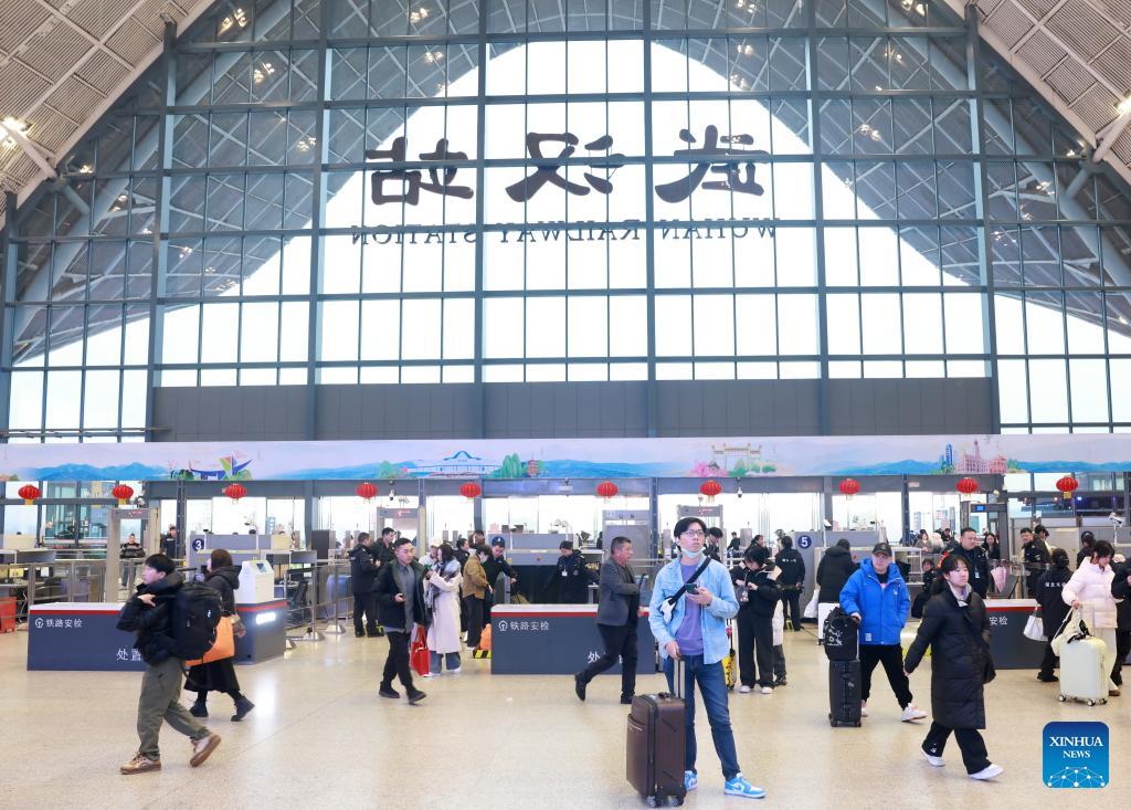 Passengers wait for trains at the Wuhan Railway Station in Wuhan, central China's Hubei Province, Feb. 15, 2026. Over 285 million inter-regional passenger trips are predicted across China on Sunday, the first day of this year's nine-day Spring Festival holiday.