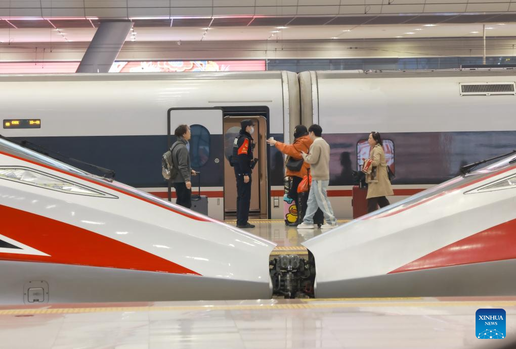 Passengers take a train at the Wuhan Railway Station in Wuhan, central China's Hubei Province, Feb. 15, 2026. Over 285 million inter-regional passenger trips are predicted across China on Sunday, the first day of this year's nine-day Spring Festival holiday.