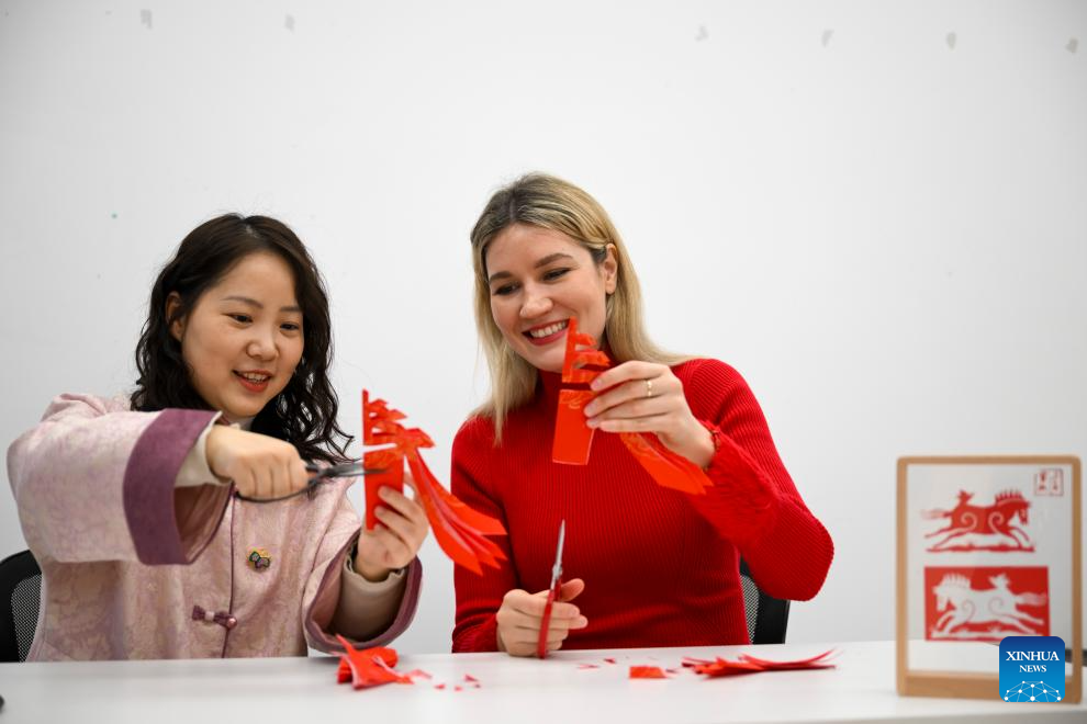 Aleksandra Antonenko (R) tries her hands with paper-cutting in Shanghai, east China, Feb. 6, 2026.