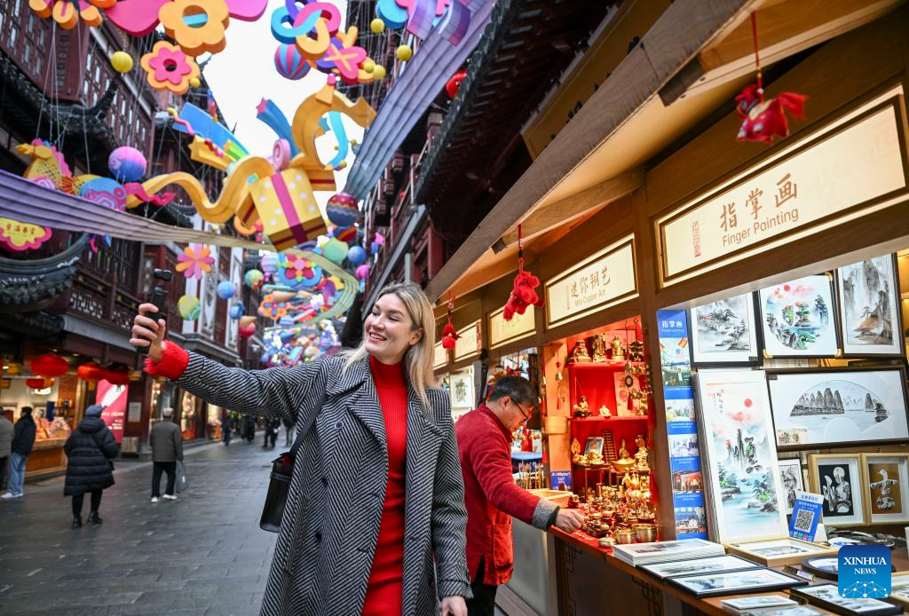 Aleksandra Antonenko takes short videos at a traditional crafts booth of Yuyuan Garden shopping mall in Shanghai, east China, Feb. 6, 2026.