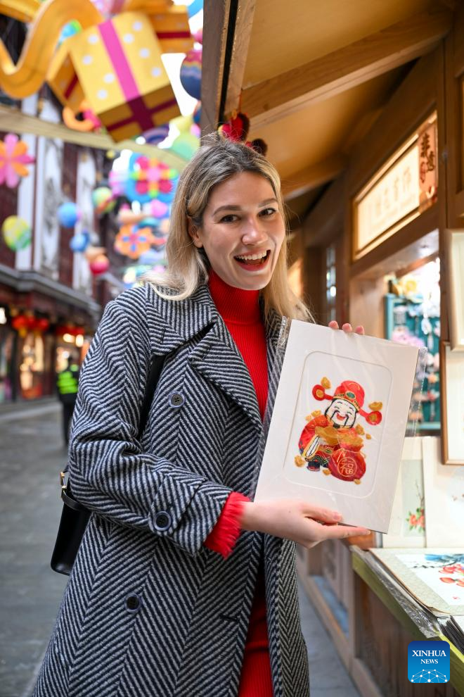 Aleksandra Antonenko poses for a photo with a Suzhou embroidery piece at a traditional crafts booth of Yuyuan Garden shopping mall in Shanghai, east China, Feb. 6, 2026.