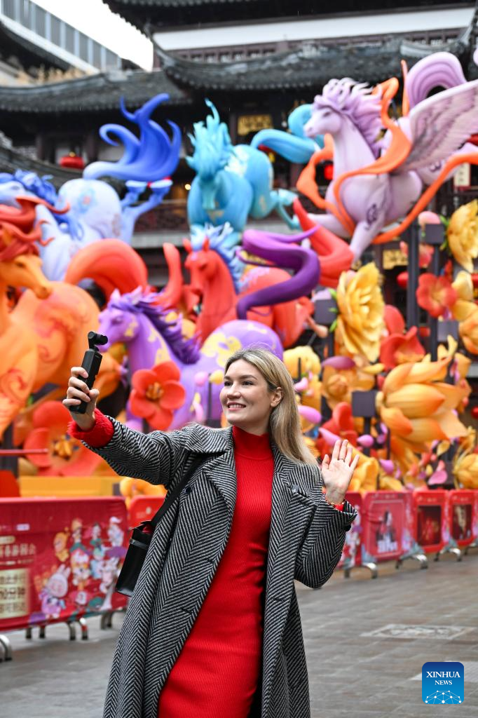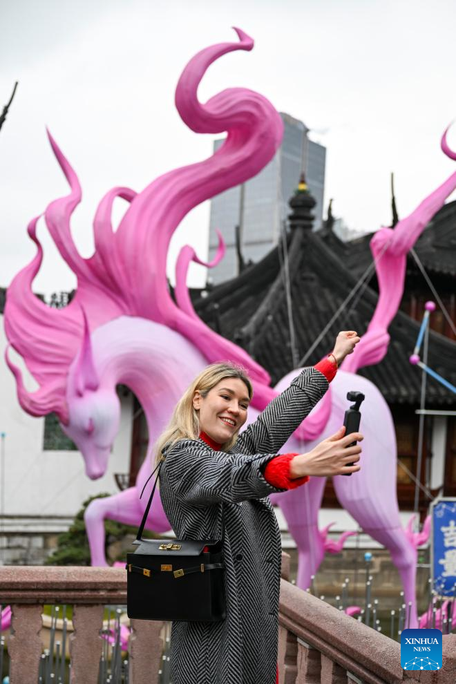 Aleksandra Antonenko takes short videos at Yuyuan Garden shopping mall in Shanghai, east China, Feb. 6, 2026.