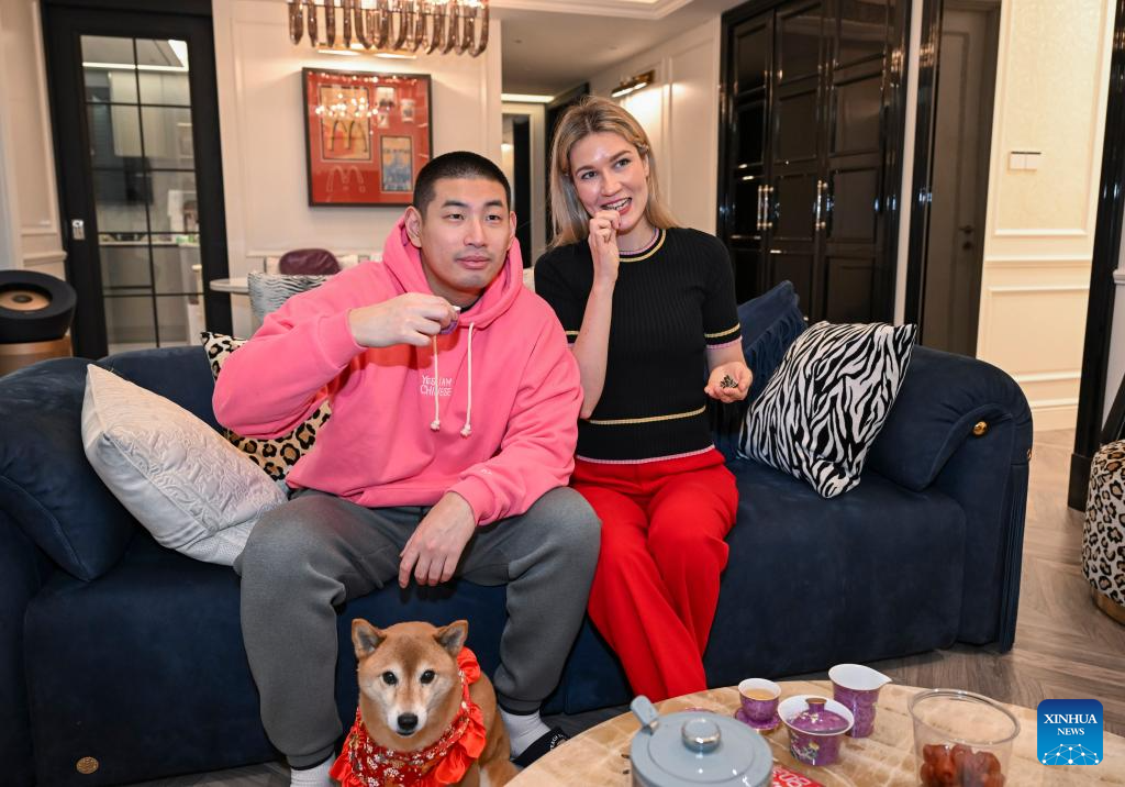 Aleksandra Antonenko and her husband Zhao Yiwei watch TV at home in Shanghai, east China, Feb. 6, 2026.