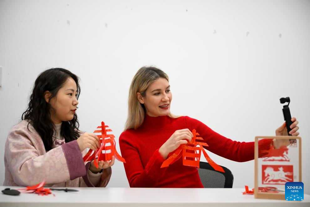 Aleksandra Antonenko (R) takes short videos on paper-cutting experience in Shanghai, east China, Feb. 6, 2026.