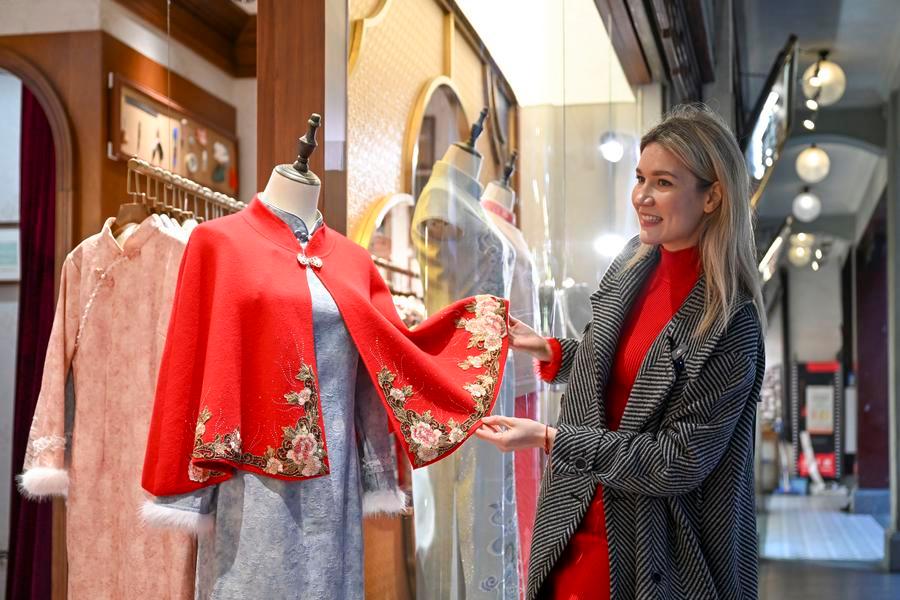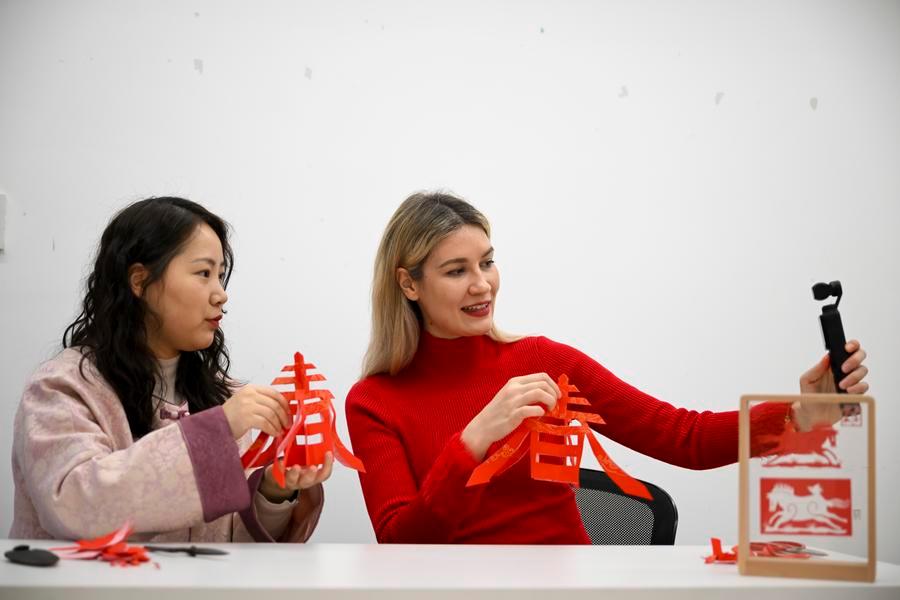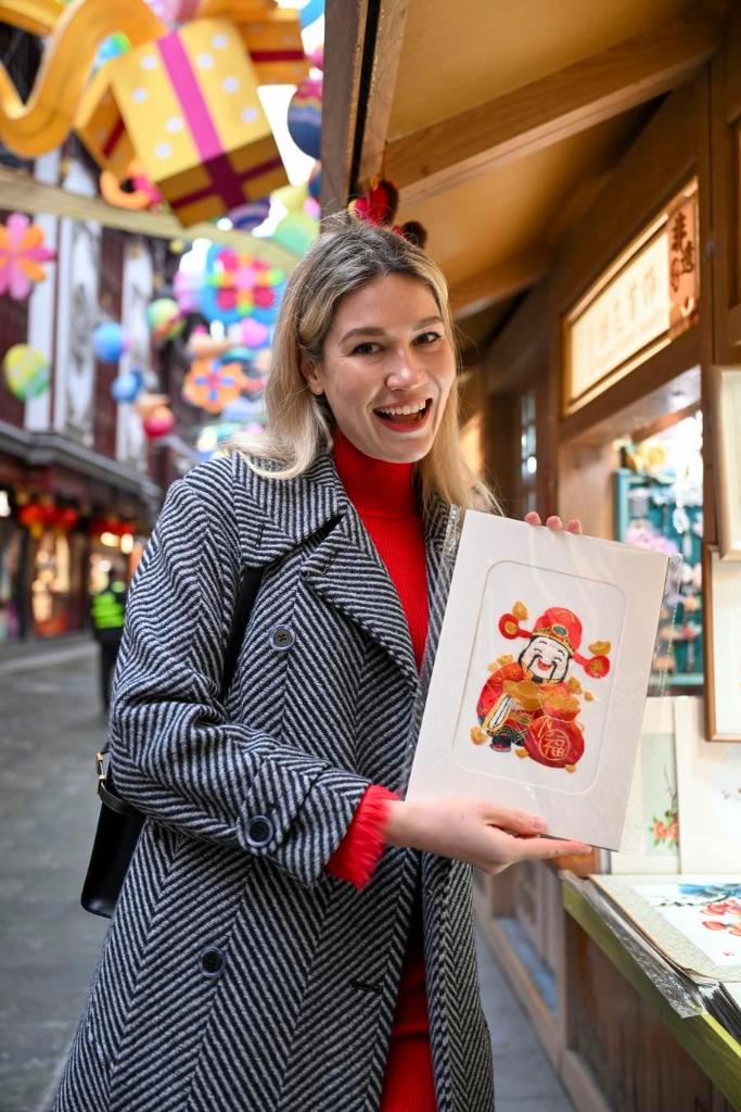 Aleksandra Antonenko (R) takes short videos on paper-cutting experience in Shanghai, east China, Feb. 6, 2026. (Xinhua/Chen Haoming)Aleksandra Antonenko selects New Year decorations at a shop in Shanghai, east China, Feb. 6, 2026.(Xinhua/Chen Haoming)Aleksandra Antonenko selects traditional Chinese costumes at Yuyuan Garden shopping mall in Shanghai, east China, Feb. 6, 2026. (Xinhua/Chen Haoming)