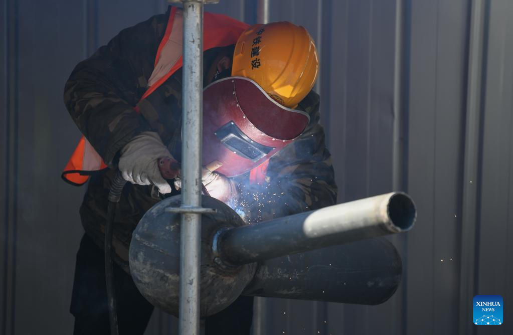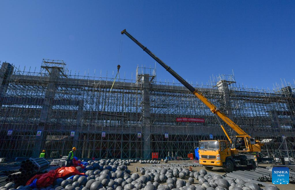 People work at Zhouliang Station of a railway linking Beijing with the Binhai New Area of Tianjin in north China's Tianjin, Feb. 26, 2022. With a length of about 172 kilometers and a designed speed of 350 kilometers per hour, the second intercity express railway linking Beijing with the Binhai New Area of Tianjin is expected to cut travel time between the two areas to 57 minutes. (Xinhua/Sun Fanyue)