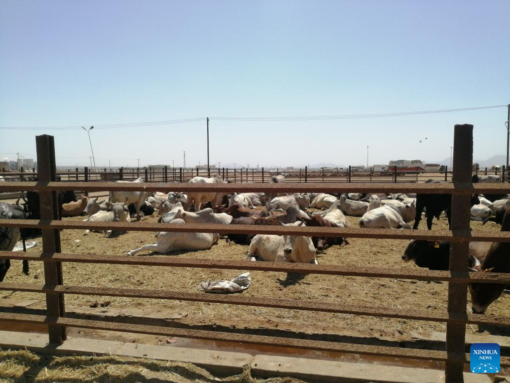 This photo taken on Nov. 9, 2025 shows livestock awaiting export in the city of Port Sudan in Sudan. (Photo by Urqia Elzaki/Xinhua)