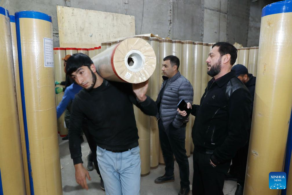 A worker of a building supplies store transfers roll flooring materials from Guangyuan of southwest China's Sichuan Province, in Tashkent, Uzbekistan, Dec. 12, 2025. The home furnishing industry of Guangyuan stands out for its high quality, and its roll flooring products sell well across China and overseas.