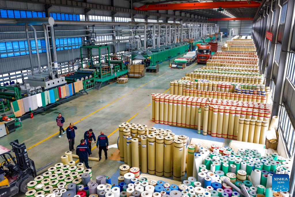 Workers work at a roll flooring manufacturing workshop in Guangyuan, southwest China's Sichuan Province, Dec. 12, 2025. The home furnishing industry of Guangyuan stands out for its high quality, and its roll flooring products sell well across China and overseas.