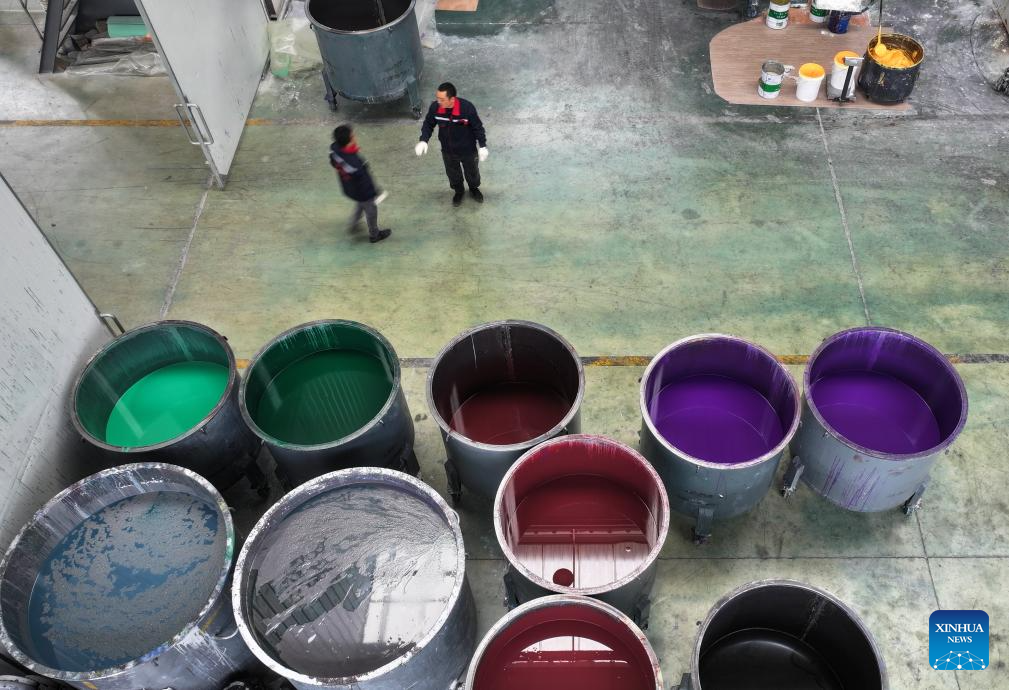 A drone photo taken on Dec. 12, 2025 shows dyes at a roll flooring manufacturing workshop in Guangyuan, southwest China's Sichuan Province. The home furnishing industry of Guangyuan stands out for its high quality, and its roll flooring products sell well across China and overseas.