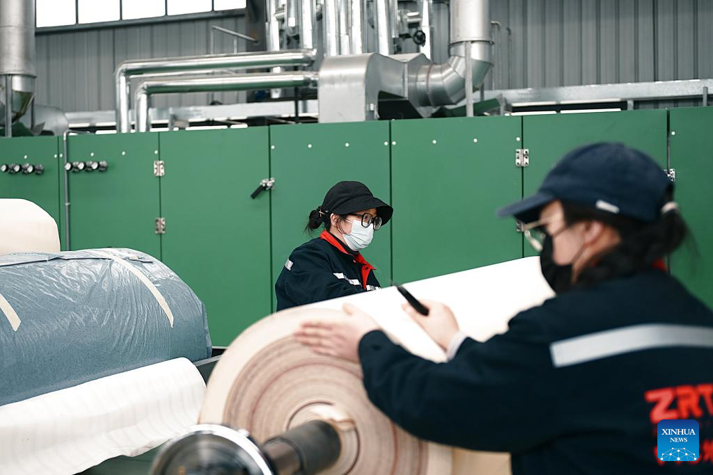 A worker works at a roll flooring manufacturing workshop in Guangyuan, southwest China's Sichuan Province, Dec. 12, 2025. The home furnishing industry of Guangyuan stands out for its high quality, and its roll flooring products sell well across China and overseas.