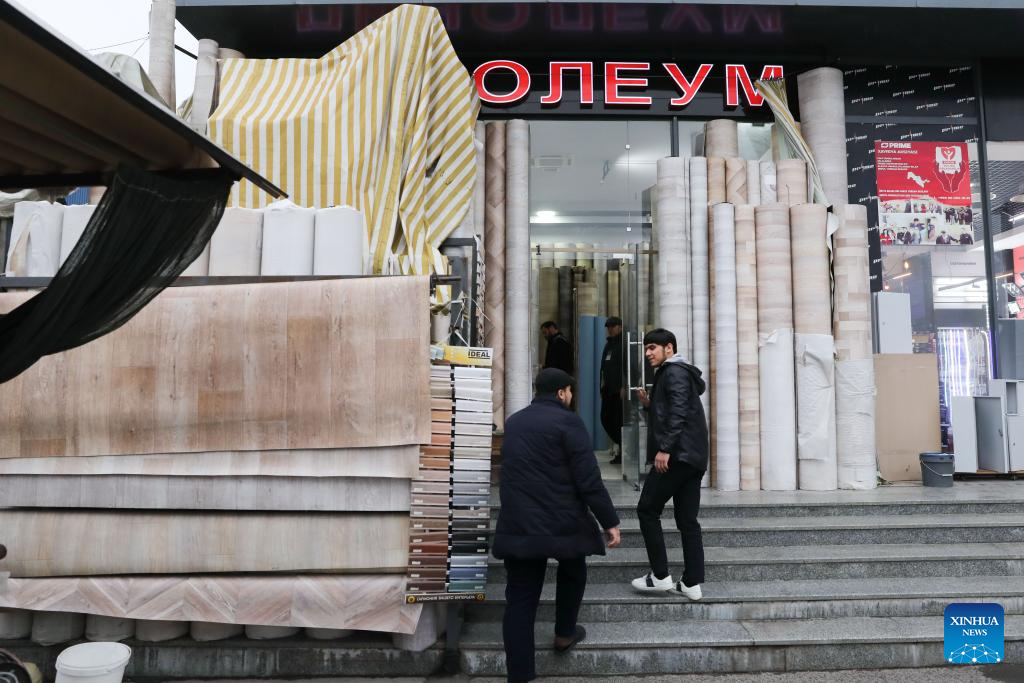 This photo taken on Dec. 12, 2025 shows Jamshid Tashpulatov's building supplies store in Tashkent, Uzbekistan. The home furnishing industry of Guangyuan stands out for its high quality, and its roll flooring products sell well across China and overseas.