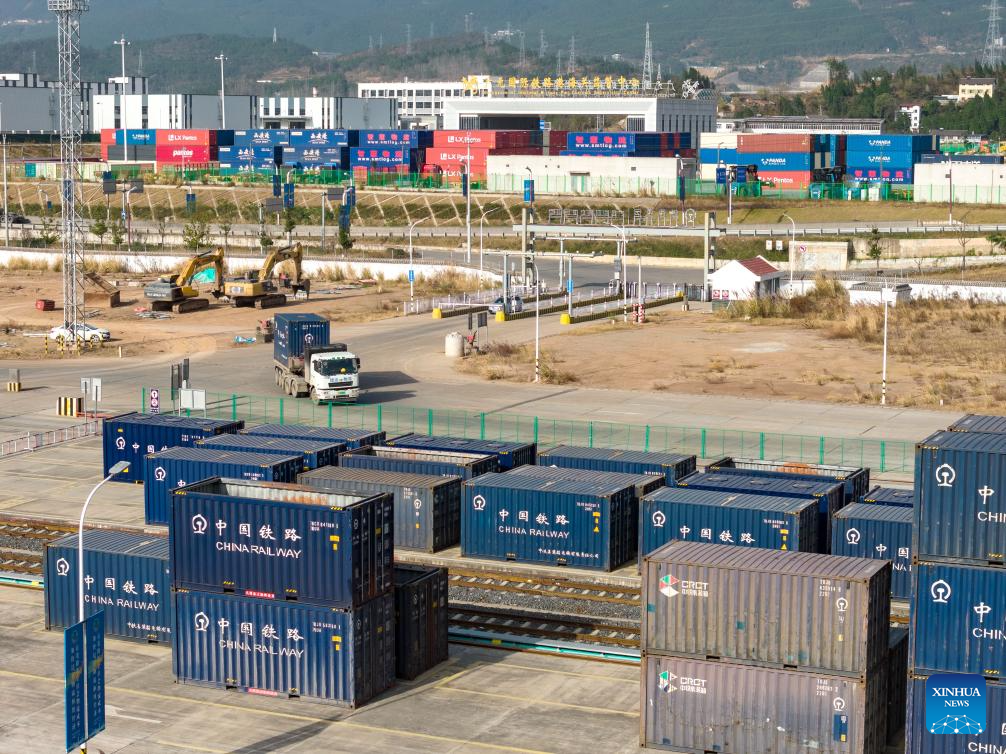 A drone photo taken on Dec. 13, 2025 shows a view of Guangyuan International Railway Port in Guangyuan, southwest China's Sichuan Province. The home furnishing industry of Guangyuan stands out for its high quality, and its roll flooring products sell well across China and overseas.