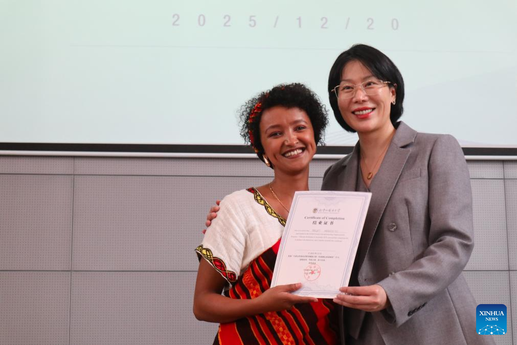 Hu Ruomei (R), course leader of the Global Female Entrepreneurship Empowerment Program workshop, takes a photo with a trainee at the graduation ceremony in Addis Ababa, the capital of Ethiopia, on Dec. 20, 2025. (Xinhua/Liu Fangqiang)