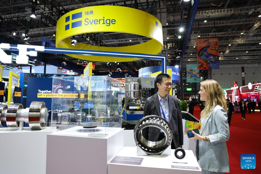 This photo shows the Sweden Pavilion during the eighth China International Import Expo (CIIE) in east China's Shanghai, Nov. 5, 2025. The eighth CIIE opened here on Wednesday. Thailand, the United Arab Emirates, Nigeria, Georgia, Sweden and Colombia serve as the guest countries of honor at this year's CIIE. (Xinhua/Fan Yuqing)