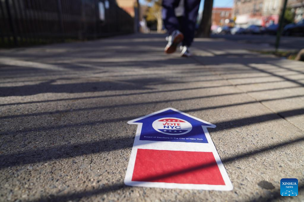 A sign pointing to a polling station is seen in Queens, New York City, the United States, on Nov. 4, 2025. The New York City mayoral election took place on Tuesday. (Xinhua/Zhang Fengguo)