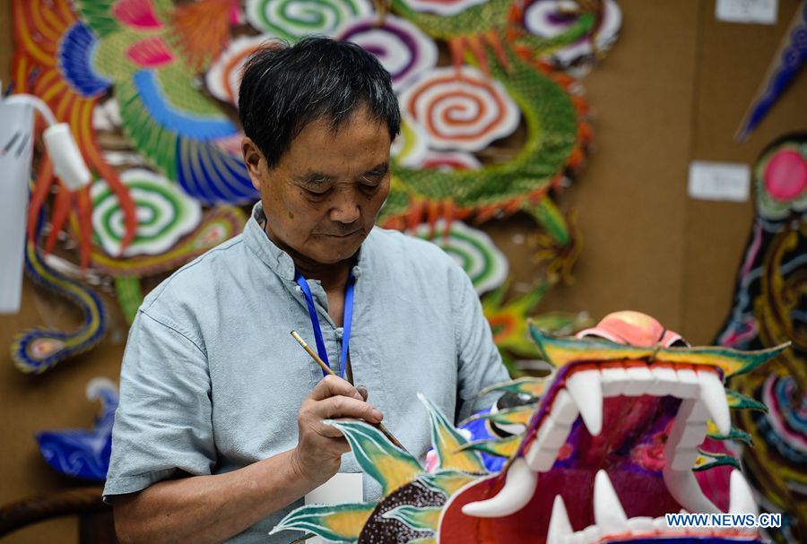 Folk artist Cheng Dishen paints on a dragon-shaped kite at the Hangzhou Arts and Crafts Museum in Hangzhou, capital city of east China's Zhejiang Province, Sept. 1, 2016. Traditional handicrafts and local intangible cultural heritages were demonstrated in the museum.(Xinhua/Li Xiang)