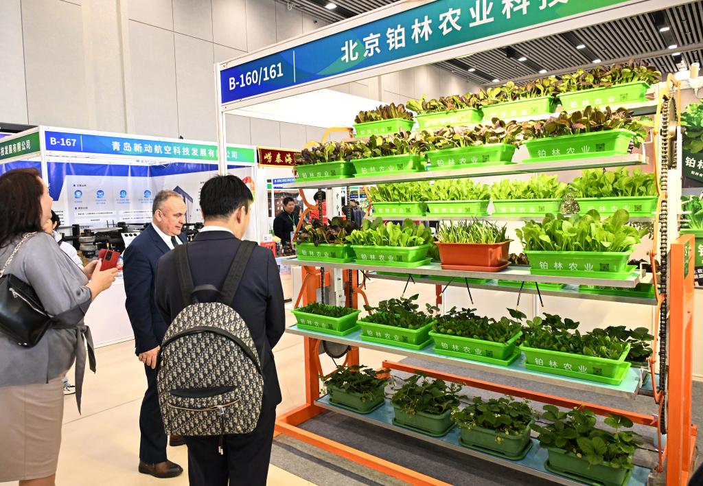 12月19日,客商在博览会上观看旋转种植设备演示。