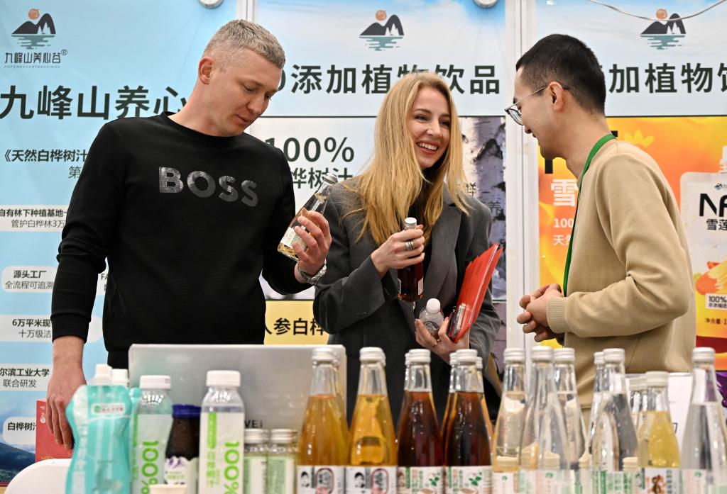 12月19日,客商在博览会一家绿色有机蔬菜展位参观。