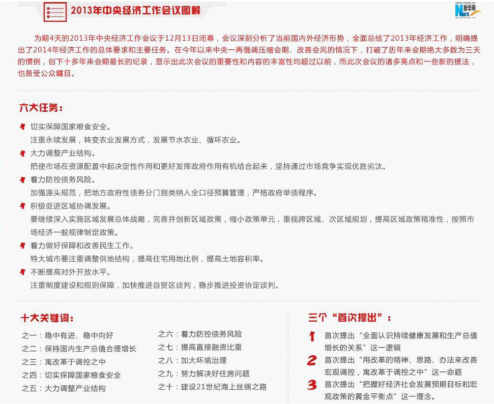 [2013年中國經濟穩進好 調控方式創新是主因] [2013年GDP是一個沒有副作用的增長] ["三產"首次超"二產"] [28省份GDP總量超全國2萬億] [外媒:2014是中國經濟改革成敗攸關一年] [收入分配改革迫在眉睫]