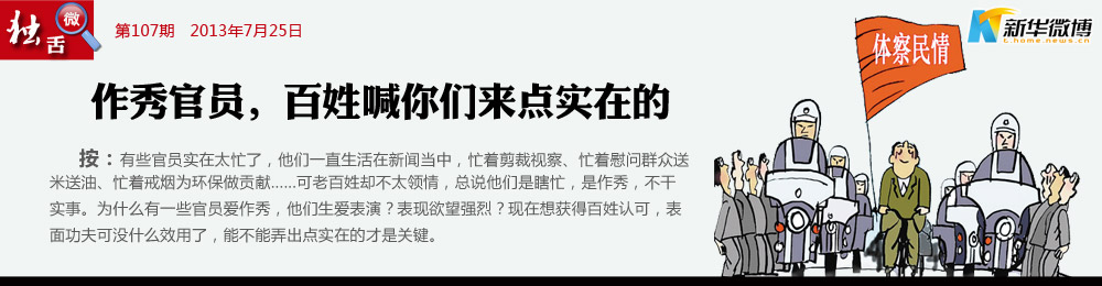 作秀為升遷 此刻正當(dāng)午,領(lǐng)導(dǎo)細(xì)揮鋤。記者勤拍照,忙煞眾下屬。隨從旁邊簇,人多造擁堵。官員忙下鄉(xiāng),鏡頭前擺譜。與農(nóng)同勞作,升遷好走路。想那雷政富,也曾載過樹。頭上是青天,腳下是黑土。干部莫作秀,好名留千古。