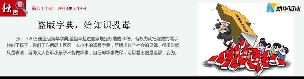 花超正版的錢,學盜版的知識! 國家為學生免費提供《新華字典》本來是一件惠民之舉,然而一些地區的落實情況卻意外“跑 偏”:盜版、盜印、錯漏百出!一本19.9元的字典,正映射出良心的“黑洞”。孩子們手中的不僅僅是不合格的字典,更是扼殺未來的“毒藥”。