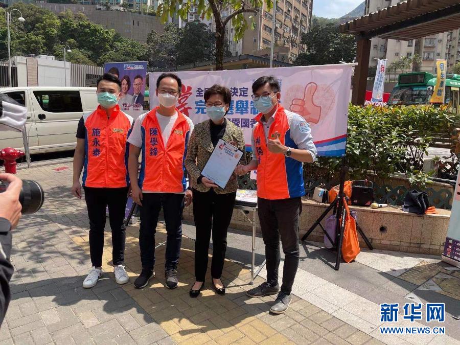 3月15日,香港特區行政長官林鄭月娥(右二)在位于港鐵堅尼地城站的街站展示簽名。新華社發