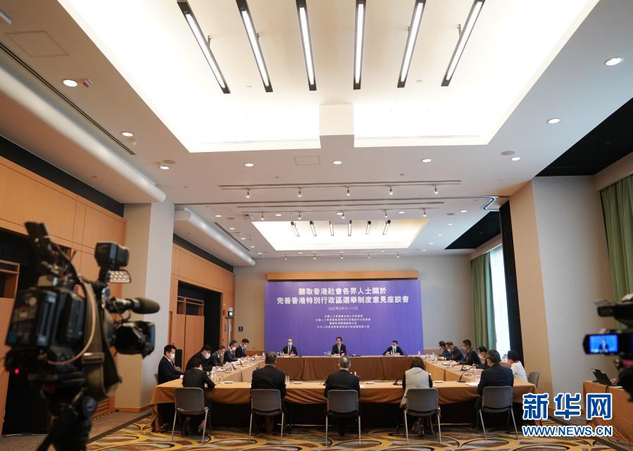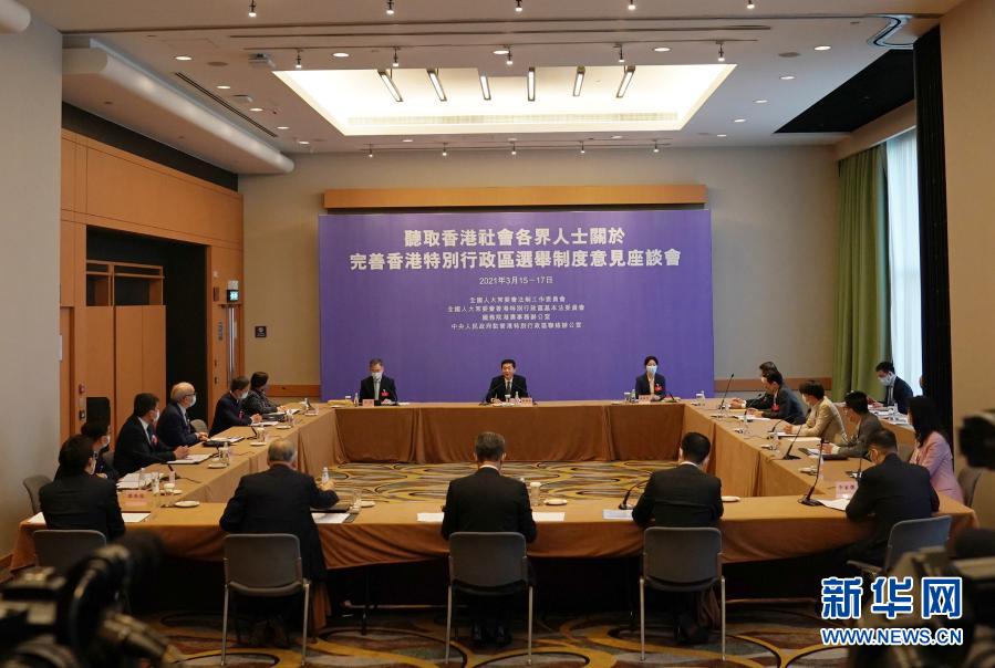 聽(tīng)取香港各界完善選舉制度意見(jiàn)座談會(huì)現(xiàn)場(chǎng)(3月17日攝)。新華社記者 李鋼 攝