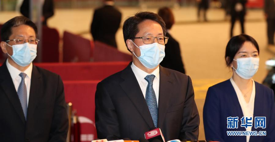 3月17日,國(guó)務(wù)院港澳辦分管日常工作的副主任張曉明(中)會(huì)見(jiàn)傳媒。新華社記者 李鋼 攝