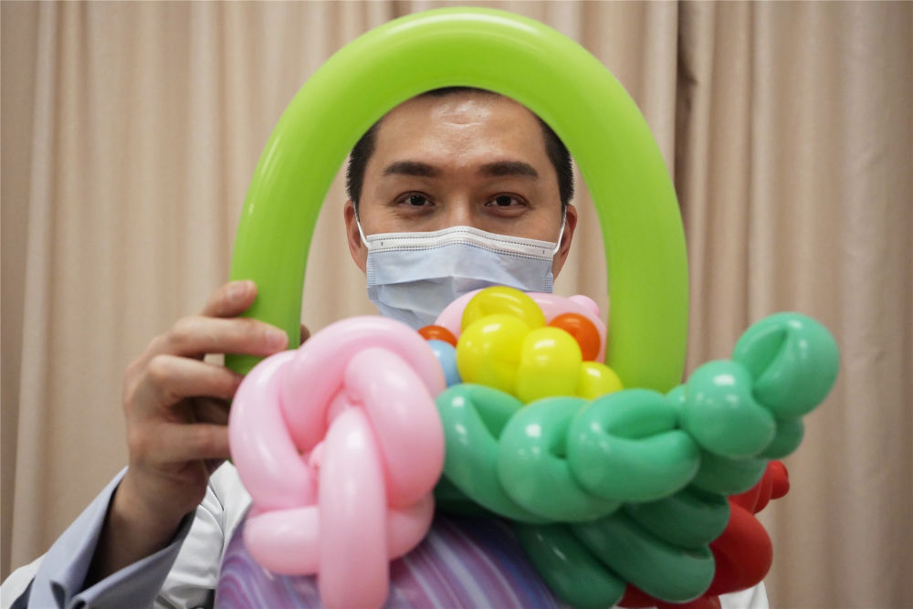 陳諾文是東區醫院的兒童及青少年科副顧問醫生。之前,為了拉近與小患者的距離,陳諾文不時親手制作氣球卡通玩偶送給他們,因而練就純熟的氣球“手藝”,被小患者們親切地稱為“氣球大夫”。疫情暴發后,他總想看看有什么地方能幫得上忙,為抗疫加油。沒想到,氣球“手藝”就這樣派上了用場。