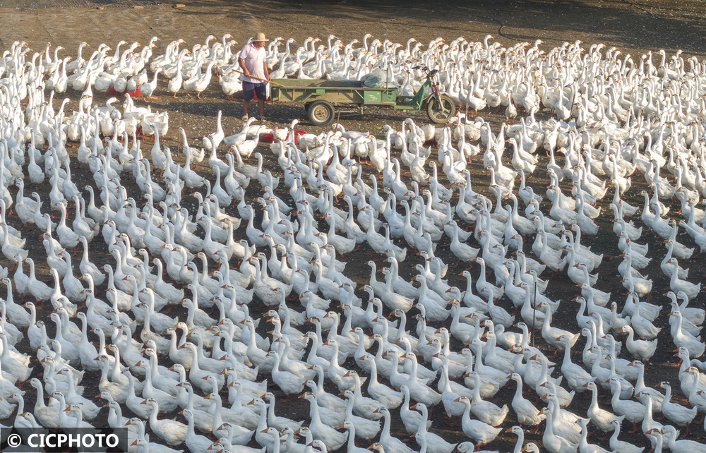 2025年7月12日,江苏省宿迁市泗洪县石集乡一生态鹅养殖基地生机盎然,工作人员正忙着投放饲料。近年来,石集乡依托滩涂等自然资源大力发展生态养殖,既盘活了闲置资源,又通过规模化养殖带动农户增收。