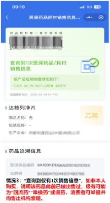 情况3:“查询到仅有1次销售信息”,如非本人购买,说明该药品此前已被出售过,极有可能为“回流药”“串换药”或假药,消费者可举报并向售出机构索赔。