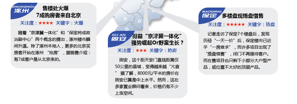 保定近一周多個樓盤價格上浮達10%;涿州一些現房遭搶購;燕郊個別項目單價超過1.5萬元……京津冀一體化的具體規劃尚未出臺,但京周邊樓市已“亢奮”。開發成本的不斷提高以及地方利益的惡性競爭,這些只可能成為一體化道路上的絆腳石...[ 詳細 ]