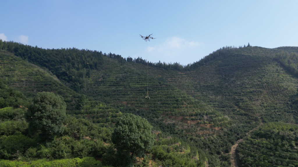 农业无人机将油茶果从种植基地吊运至山脚。(黄群 摄)