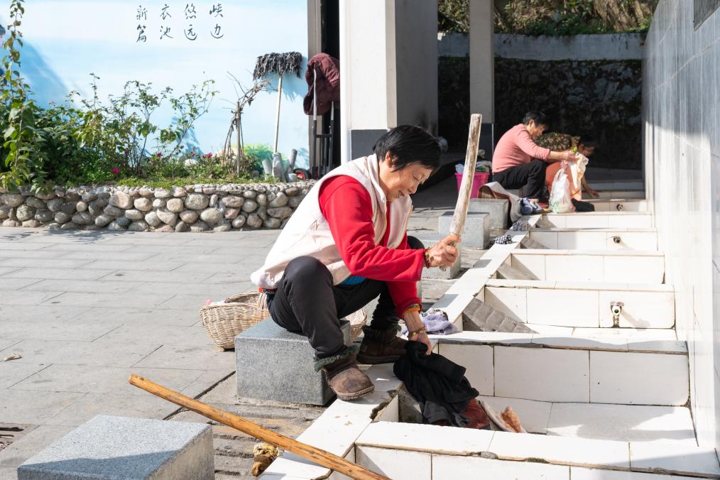 暖阳斜洒在背上,也映衬着她红扑扑的脸颊。旁边有村里新建的共享洗烘房,可以洗大件衣物,但李梅斌还是保留着峡江人家捶打洗衣的传统习惯。