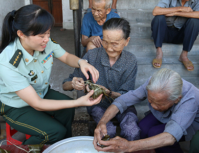 官兵與敬老院老人一起包粽子