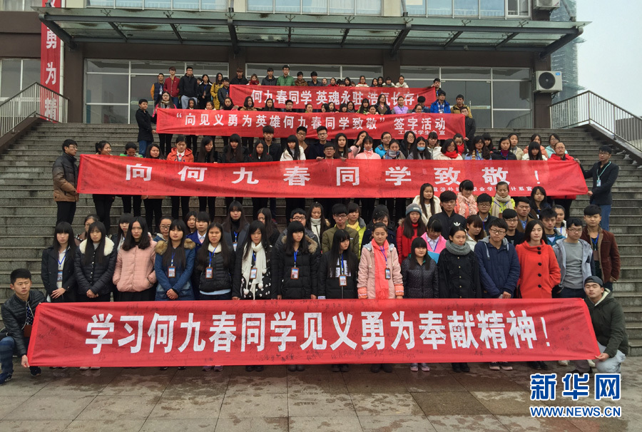 危難時刻挺身而出,英雄壯舉催人淚下。何九春的同學們紛紛自發的打出標語,向何九春致敬。