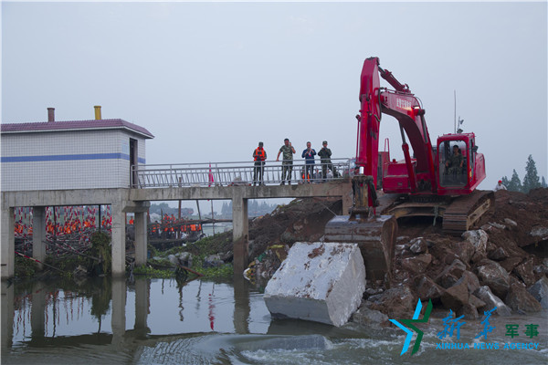 在湖南華容新華垸,武警交通二總隊利用大型機械向決口處拋投石塊。
