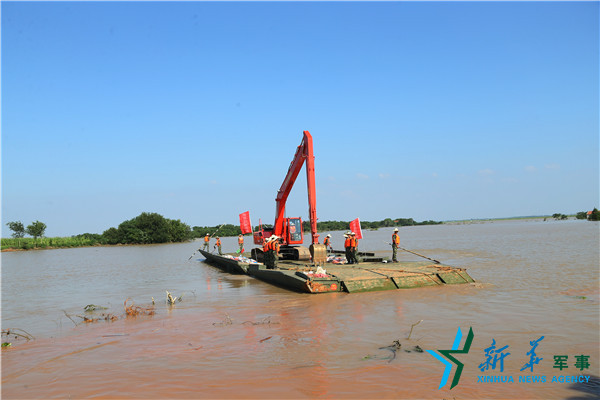 在湖北孝感,動力舟橋將挖掘機運送到對岸,雙向封堵。
