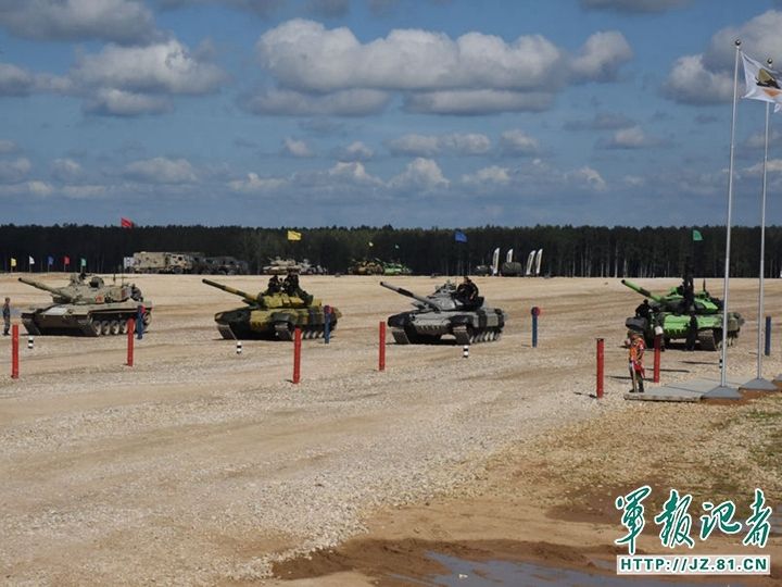 “坦克兩項(xiàng)”半決賽接力賽中國、吉爾吉斯斯坦、亞美尼亞、安哥拉的4輛坦克準(zhǔn)備出發(fā)。武元晉 攝