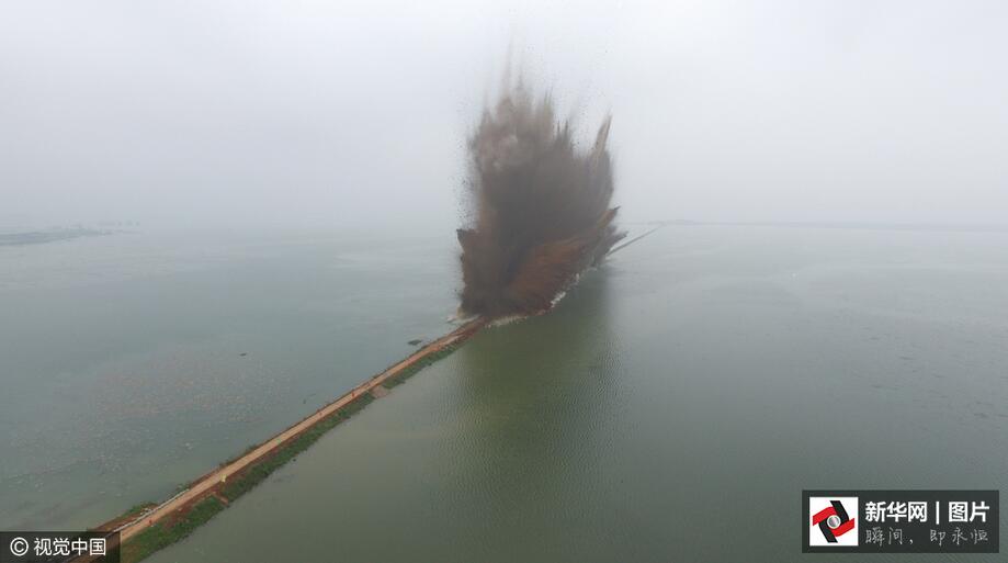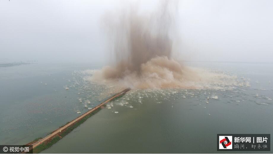 ??? 7月14日7時,伴隨著一聲聲的爆破轟鳴,梁子湖與牛山湖隔堤正式實施爆破作業(yè),這標志著湖北梁子湖流域的牛山湖正式破垸分洪。(圖片來源:視覺中國)