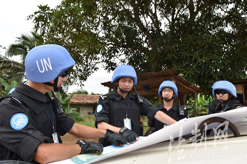圖為防暴隊黨總支書記徐曉偉(左三)帶隊執行利比里亞博米州武裝巡邏任務