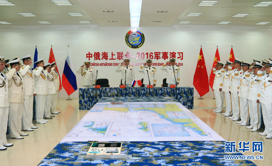 ????9月13日,中俄“海上聯合—2016”軍事演習開幕式在演習導演部舉行,中方總導演、中國海軍副司令員王海和俄方總導演、俄羅斯海軍副司令費多堅科夫共同宣布演習開始。