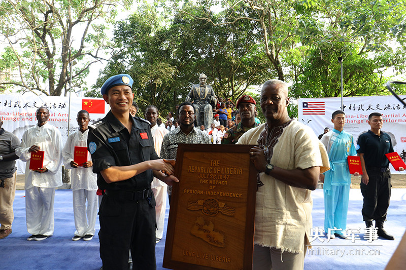 ????11月11日,中國駐利比里亞大使館、中國第四支駐利比里亞維和警察防暴隊攜同利比里亞國家武術(shù)協(xié)會在利比里亞大學舉行中利武術(shù)交流活動。