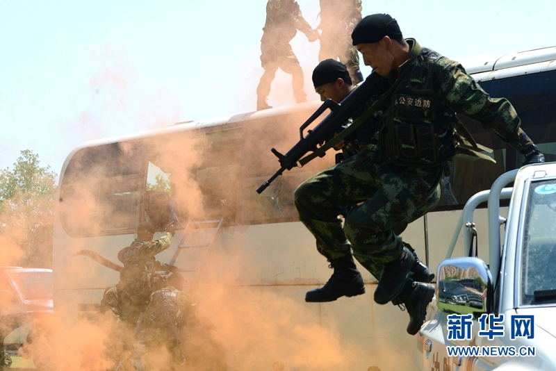 特勤隊(duì)官兵對(duì)藏匿在公共汽車內(nèi)的“歹徒”進(jìn)行突擊。