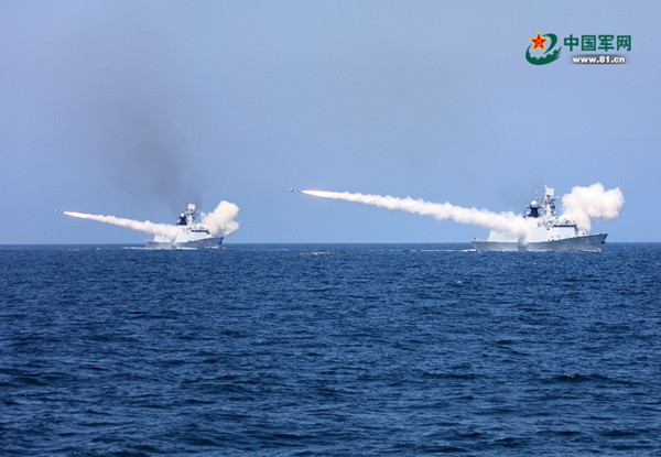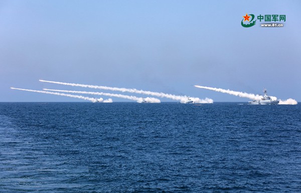 8月7日,海軍在黃海、渤海相關??沼蚪M織實兵實彈對抗演習,最大限度檢驗體系作戰能力、戰法訓法、武器裝備效能,共實射各型導彈數十枚。這是水面艦艇齊射反艦導彈。李唐 攝(圖片來源:中國軍網)